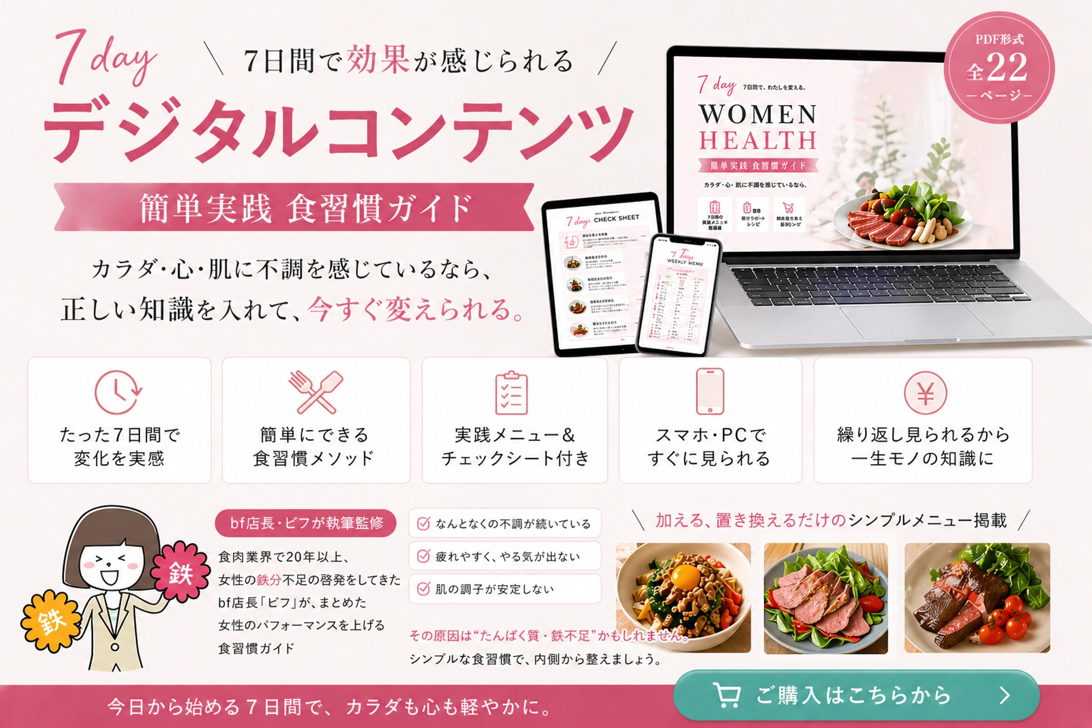 食肉業界20年以上、女性の鉄分不足の啓発に関わってきたbfキレイ店長「ビフ」が執筆・監修。女性のパフォーマンスを上げる食習慣を、「7日間の実践プログラム」としてまとめました。